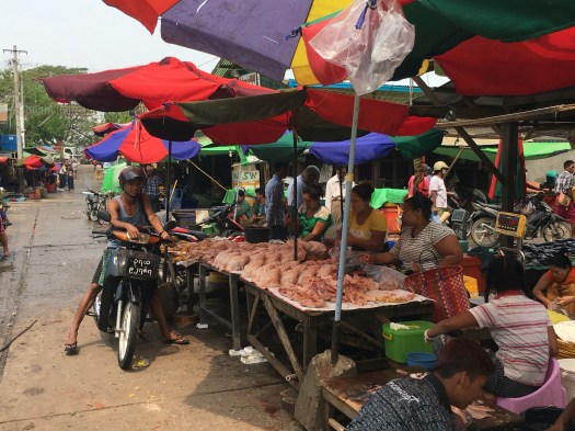 For my last day in Myanmar, I hiked a mountain barefoot with my pack that seems to be getting heavier by the day, ate lunch at a local restaurant on the river (I will spare you some details, but just mention it included Chicken which you will see soon in my market photos…), watched barrels of sugar being unloaded from the cargo boats, meandered through the local market, toured more pagodas, then hopped a plane back to Thailand.
