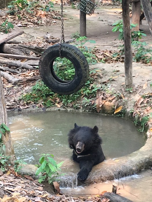 Yesterday was a magical day spent with my new friends Bryan and Triann from Saskatchewan. We met in town and caught a tuk tuk to the Kuangsi Waterfall Park. We arrived early, so there were very few people. We began the hike up the trail, beginning with a bear rescue where they have taken in many injured sun and moon bears. They were so fun to watch as they played on their hammocks and bathed in their pools.