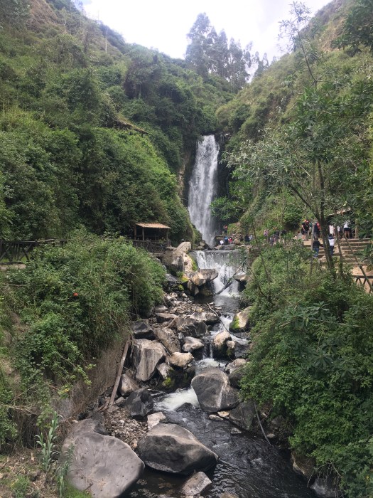 I got up this morning and decided to take a walk out of town to find Cascada de Peguche. The only instructions I had from a blog I read was to take a trail from the north most side of town, so I figured it was going to be an adventure. I turned on the compass app, found north and started trekking in my Tevas! I reached a river and thought I was doing good by heading upstream, but the road ended and I had to ask….Luckily I had saved a screenshot of the blog with a picture and the name of the falls. An awesome man named Edgar overheard me stumbling through my Spanish and offered to help. He walked me across town, past his work and pointed me in the right direction. It turns out I was a little off 😆😆 I was supposed to follow the train tracks, not the river. Of course!!