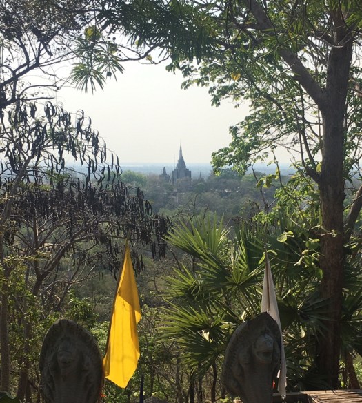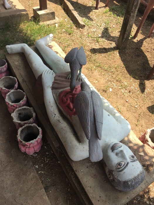 First we headed about 25 km away through the country to see Wat Hanchey, a pagoda built in the 8th century with a bunch of strange fruit statues around it. It sits on top of a mountain with amazing views of the Mekong. On the way, we were waiting to cross a bridge and I asked what the man was selling on the street side. Chhay told me it was banana leaves wrapped around sticky rice with banana and coconut…sounded good, so I tried. Pretty good for a quick energy snack!