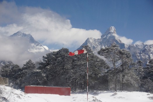 There were four others on the tour and we all met early in the morning at our hotel for a bit of breakfast and briefing. From there, we drove to the helicopter terminal at the Kathmandu Airport and waited for the fog to lift. A short time later, Troy and I were up in the front seat with the pilot and we were lifting off in our “dragon” helicopter! We flew through the rugged Himalayas for about 30 minutes until we reached the Lukla “Tenzing-Hillary” Airport where we had to refuel.