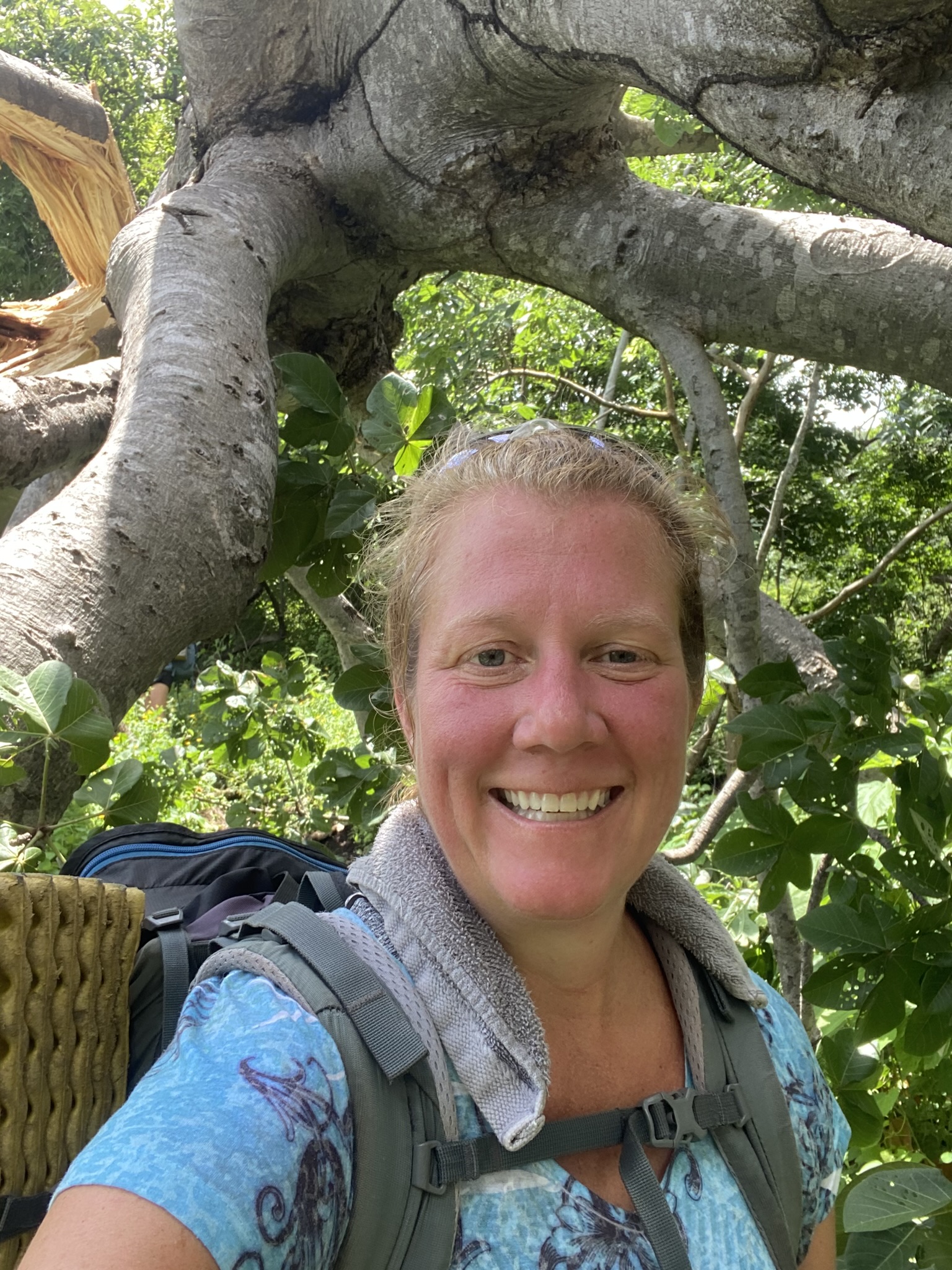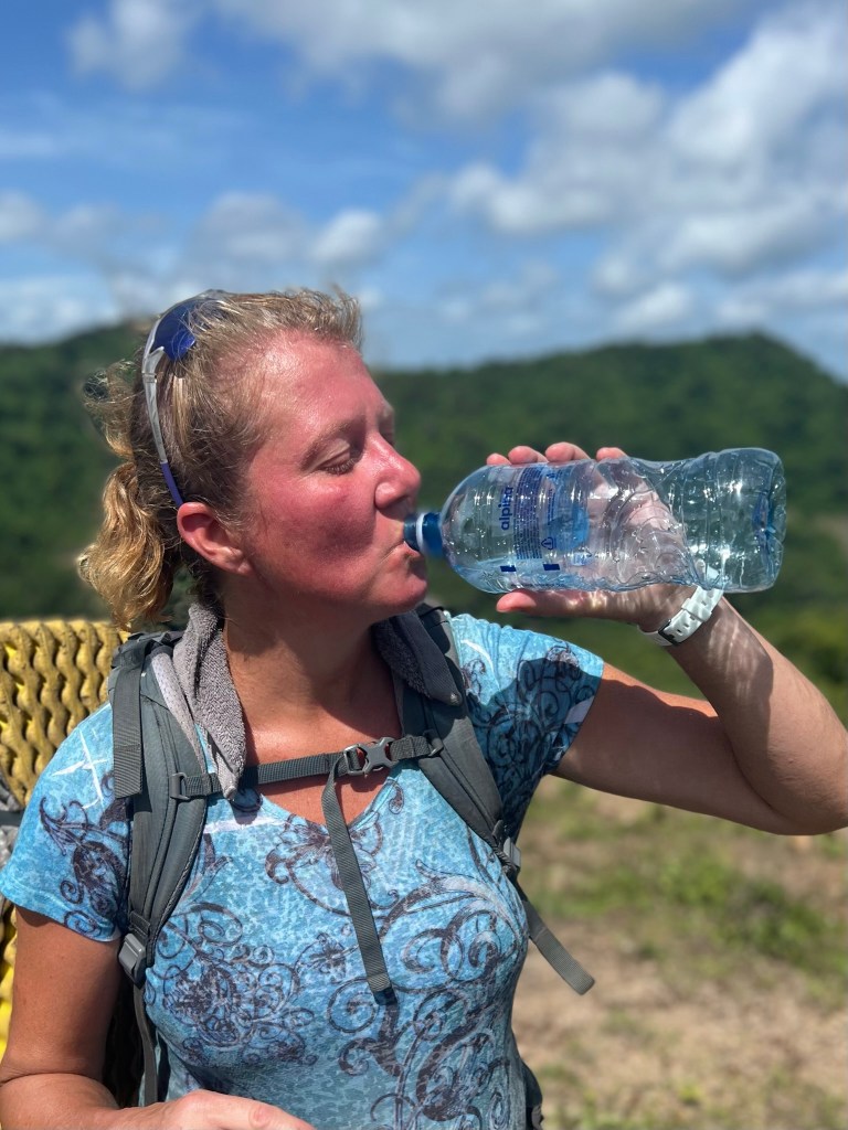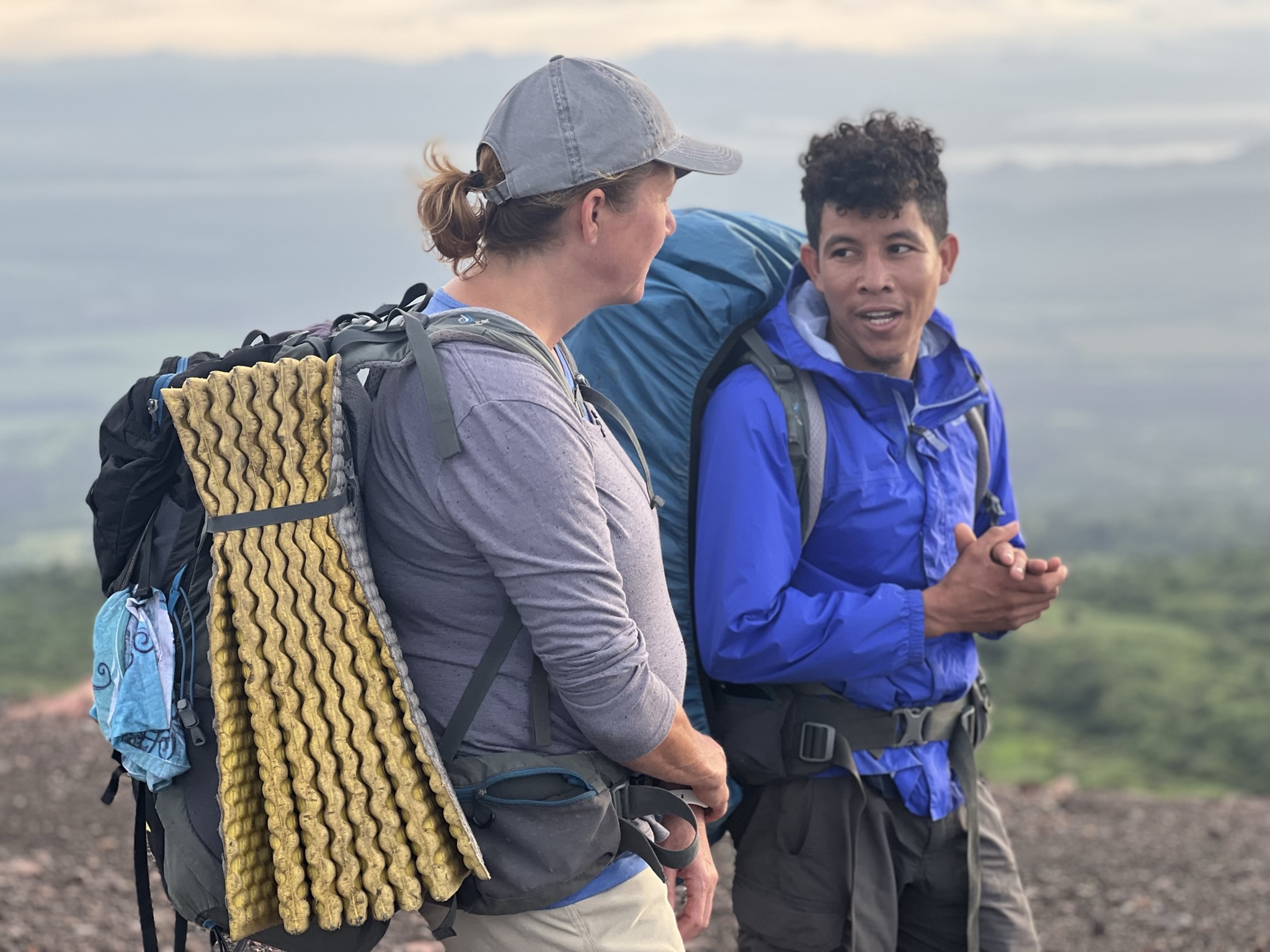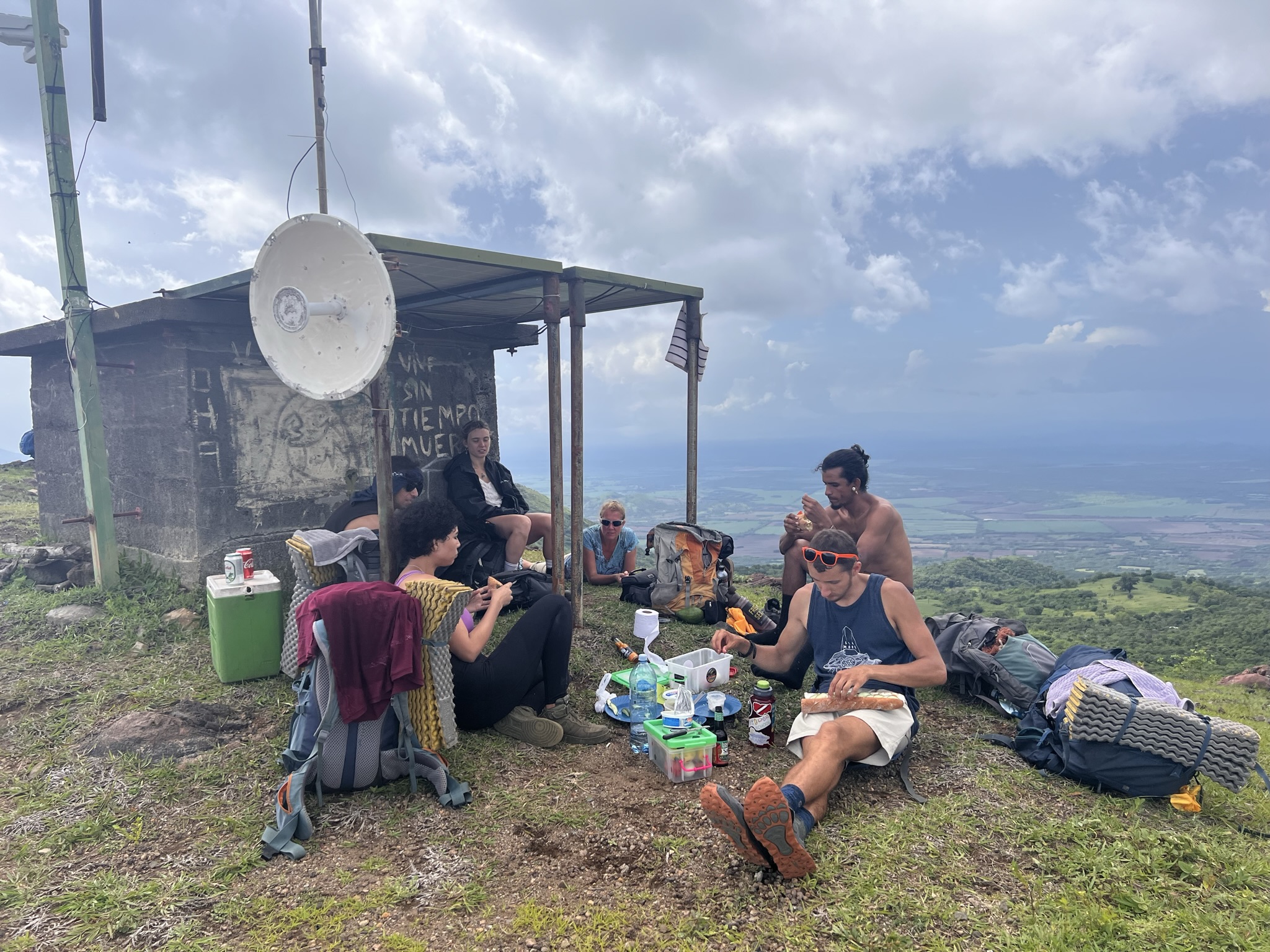 Telica Volcano Camping: When the day came for my camping trip, me, a guide, and two volunteers, loaded up our packs with tents, sleeping bags, 6 liters of water, and our personal stuff (about 30 lbs/13 kg), and headed out in the truck with another couple and their guide/volunteer who would join us for the hike and sunset piece. The roads to the volcano were pretty bad as there was a huge downpour the night before, so we had to reroute a couple of times to reach the trailhead. The hike in through the jungle and up the 1,061 m/3,480 ft volcano to the crater was about 3 hours and very hot, rocky, and sweaty, but beautiful and well worth the energy. When we reached the top we were rewarded with a beautiful veggie baguette sandwich that the guides prepared. The man who works at the monitoring station had a cooler of beers for sale as well. It was so delicious and much needed!