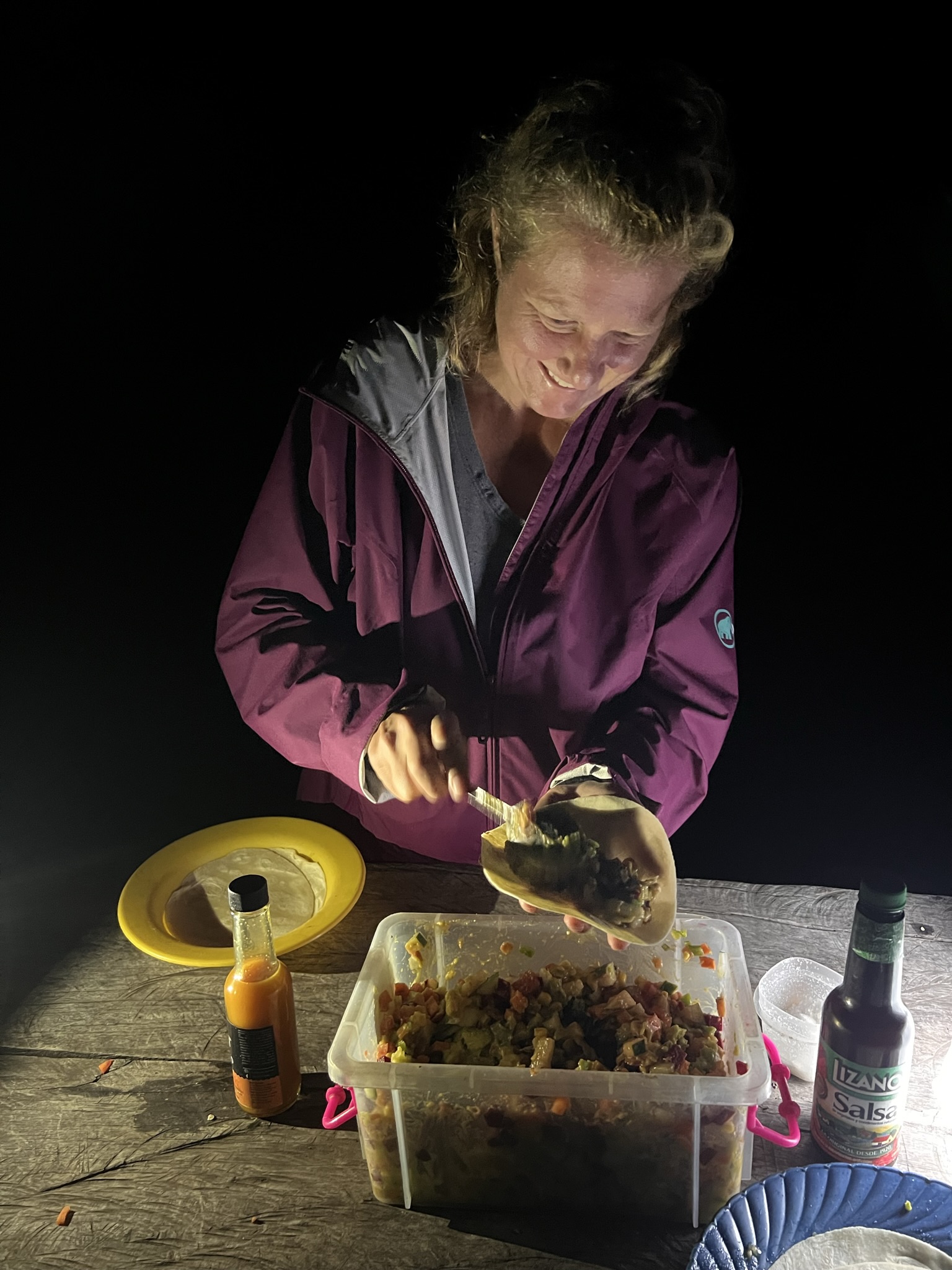 We hiked down to camp with our headlamps and as the guide made a fire, we prepared our dinner which was also delicious…a fresh veggie mixture with beans, avocado, cucumber, beets, corn, smashed chips and wrapped in tortillas. After dinner we even got to toast marshmallows! Amazing!