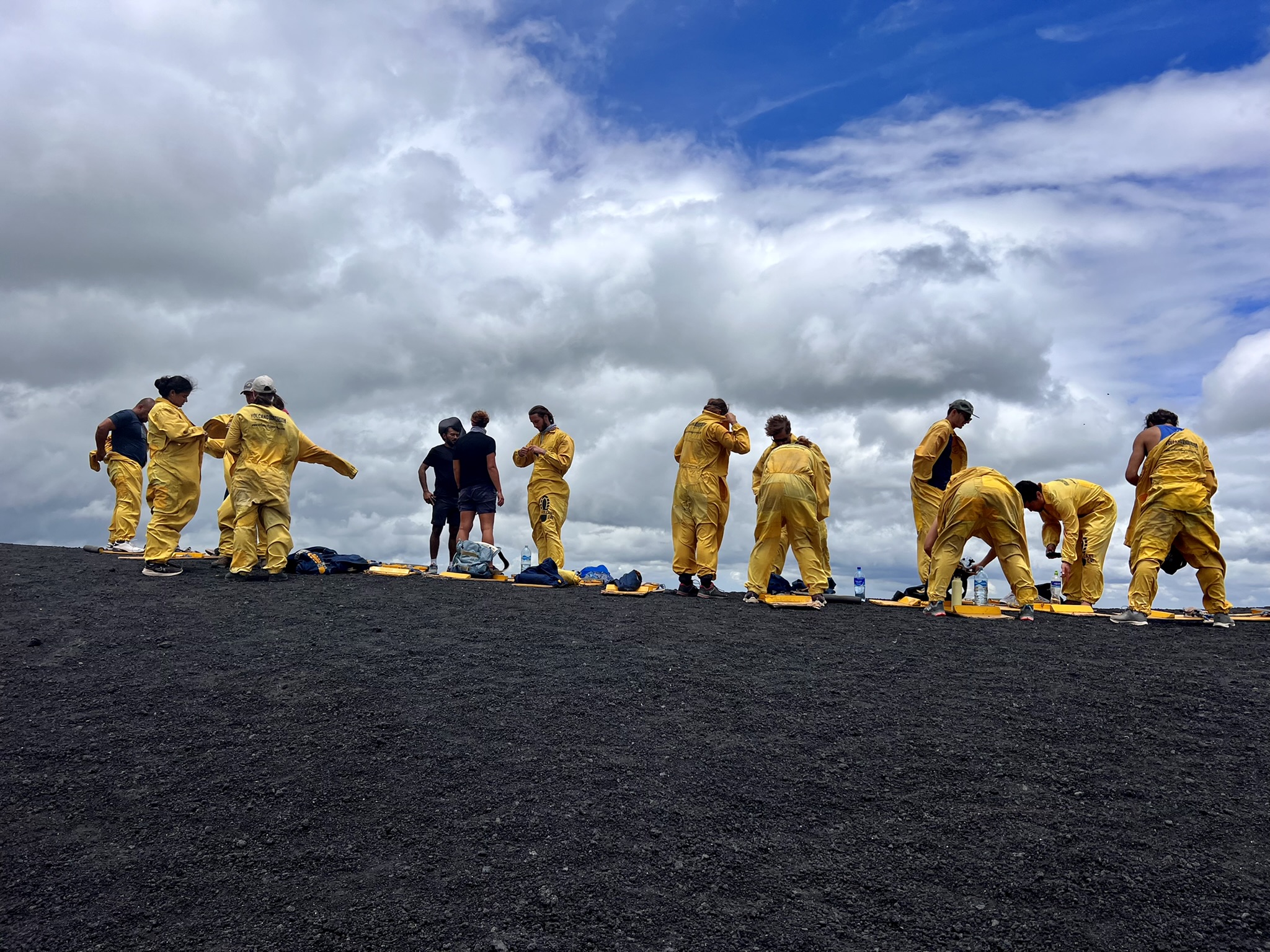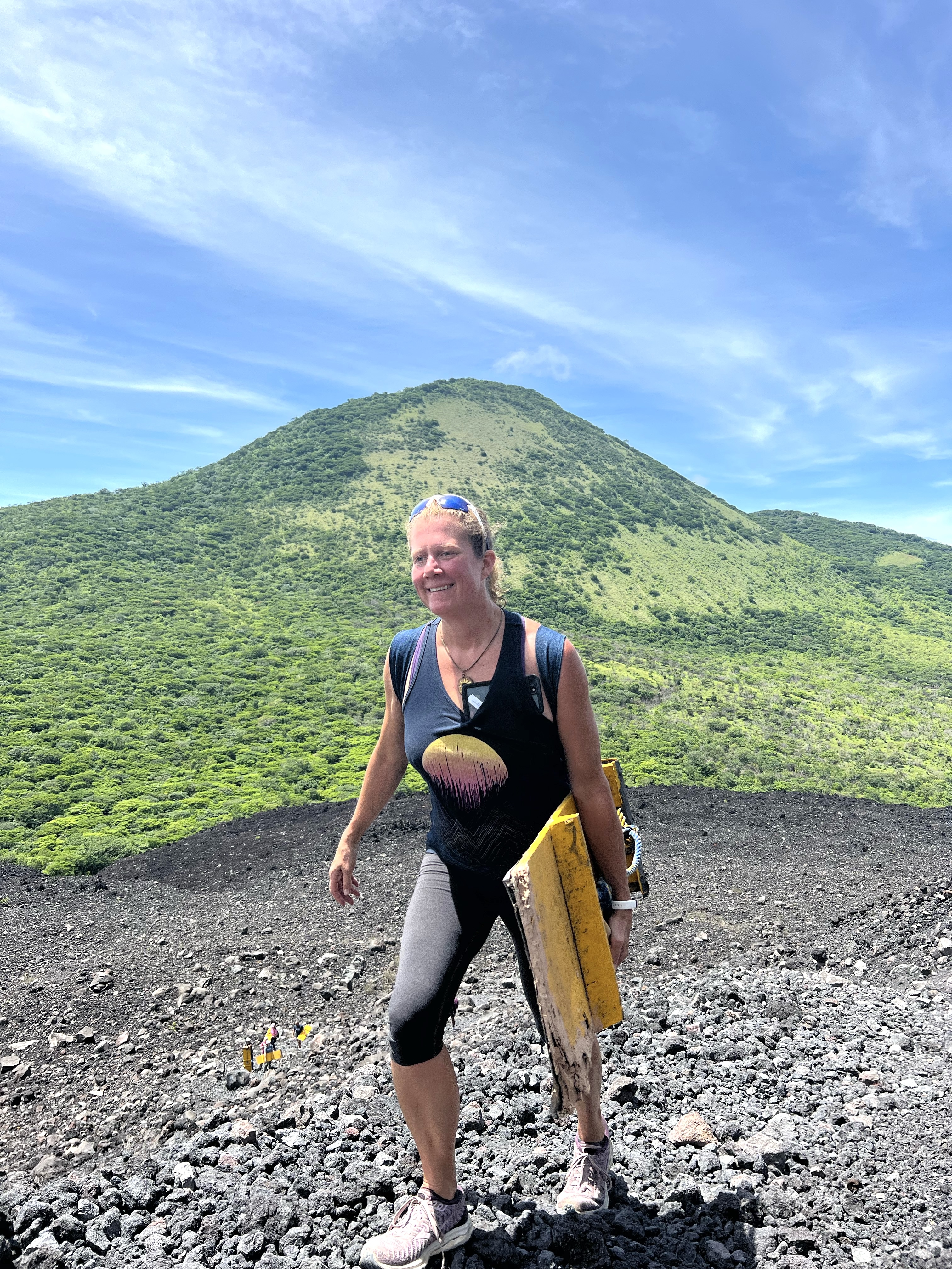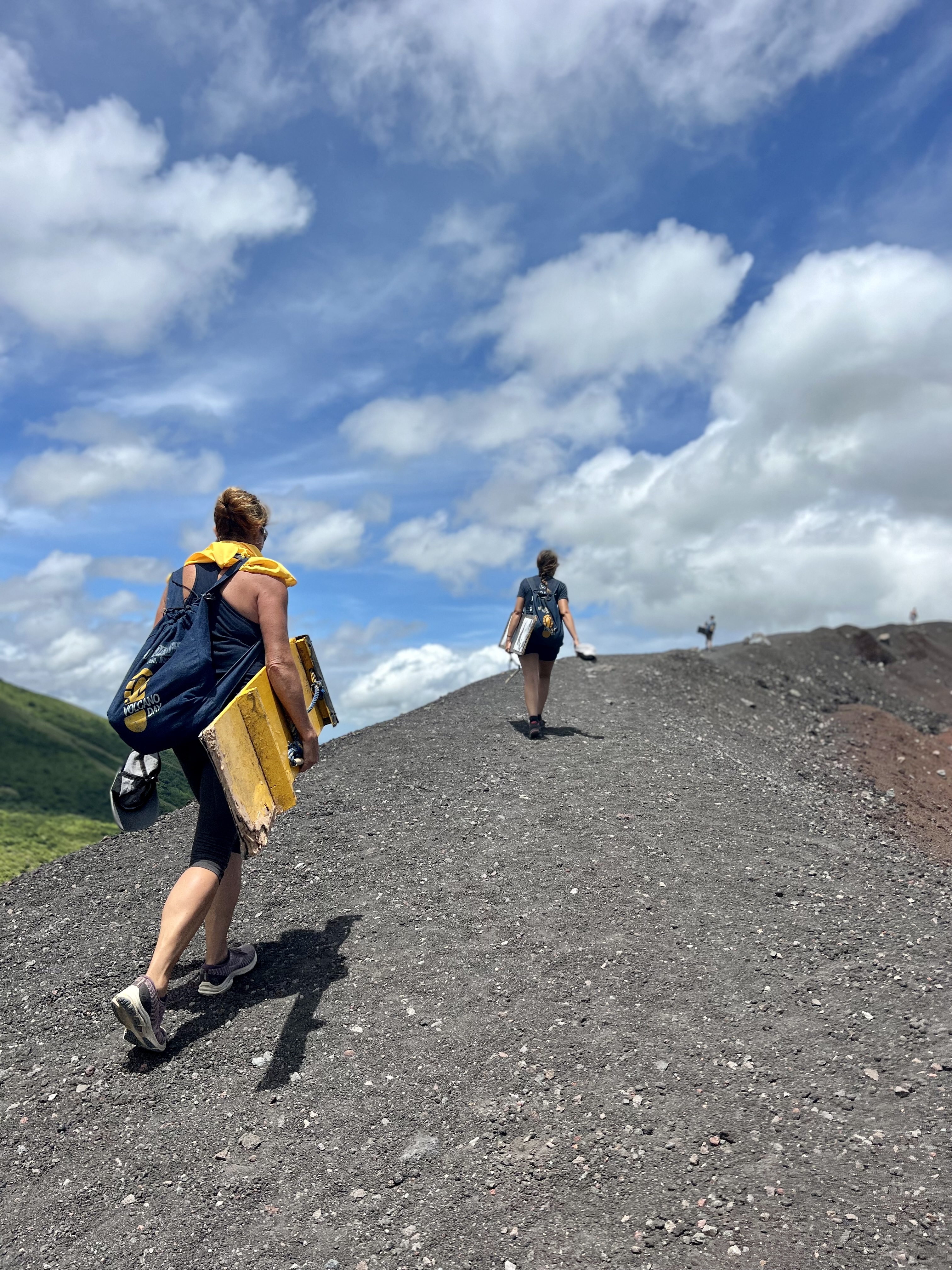Volcanoboarding at Cerro Negro (the completely black volcano): We piled in the back of the truck with our gear and boards and headed to Cerro Negro about 45 minutes away. When we arrived, we unloaded the truck and received our boards and packs with goggles, gloves, and protective suits. The hike up the 728 m/2,388 ft volcano through the lava fields was about 45 minutes and the views were stunning. We could see many other active and inactive volcanos all around and had the luxury of a bit of cloud cover and breeze thankfully! At the top we geared up, got our instructions, and headed down the hill. It was a fun, dusty ride down, and well worth it!