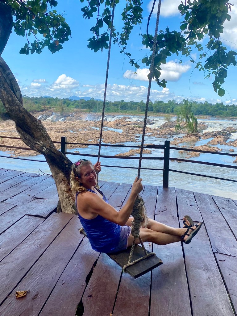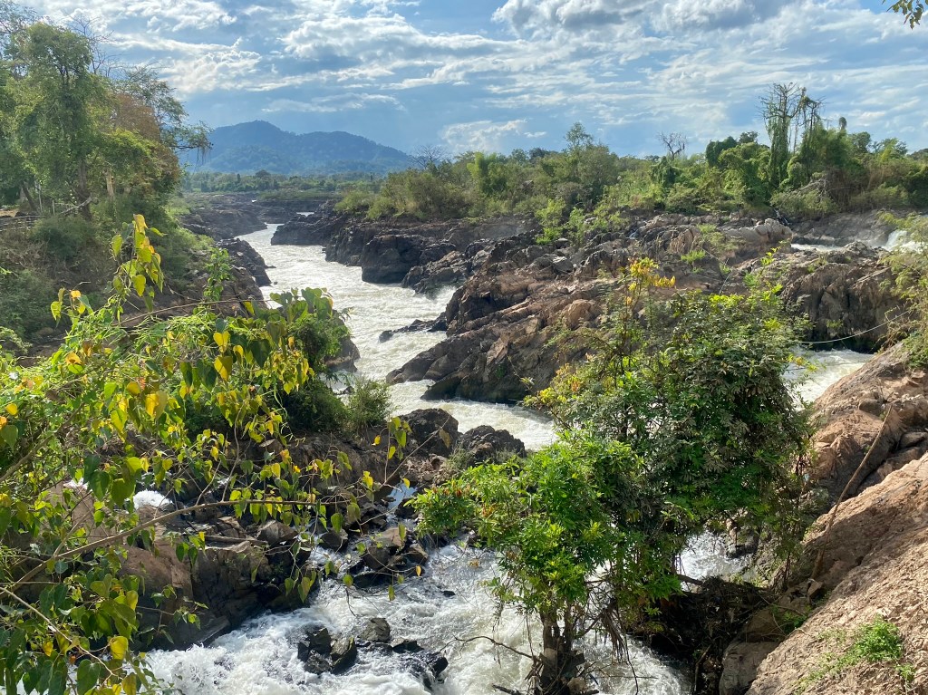 Later in the evening, I received a message from Johanna that she was able to arrange a boat and tuk-tuk for us the next day to see the largest falls in SE Asia, Khone Phapheng Falls. Yippee! We met the next morning and headed out on our adventure. Being on a boat on this part of the Mekong is a treat in itself as it is enormous, and looking in some directions, all you can see is water forever! It is beautiful! We arrived early to the falls, and again, pretty much had the whole park to ourselves. This one is a bit more kept up, and “touristy”, as it has more accessible paths to the viewpoints, but still offers climbing through the rocks for those who want to explore and get a glimpse of the up close views!