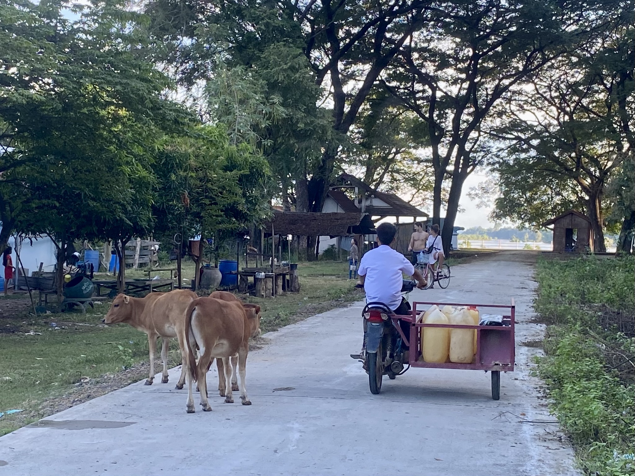 After the falls, I returned to my hotel. When I had inquired about the bike rental, a kind woman, Monica, said she was done with hers and I could use it, so I found her to let her know I was back. She was excited to see me and invited me to join her and her husband Joel for Thanksgiving dinner at a restaurant just across the old French bridge on Don Det. They had even arranged a couple of bottles of wine, a rare treat in Laos!! Oh my gosh, I hadn’t even realized it was Thanksgiving…?!?, so of course, I excepted, excited to have someone to celebrate with! We chatted for a couple of hours over a nice dinner of French Fries and Pad Thai, discussing our adventures. They have both traveled a ton, and had met in a Polar Bear center in northern Canada. She is also an artist, and Joel was an outward bound guide in his younger years. Their stories of travel and adventures were so interesting to hear, and really helped me see that I am on the right path for me!!