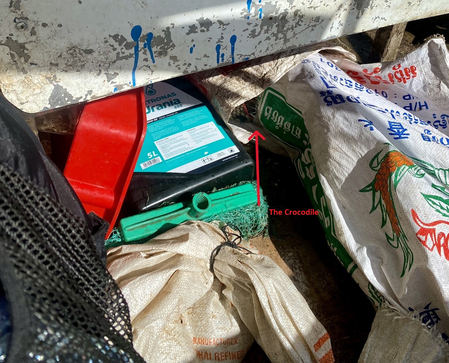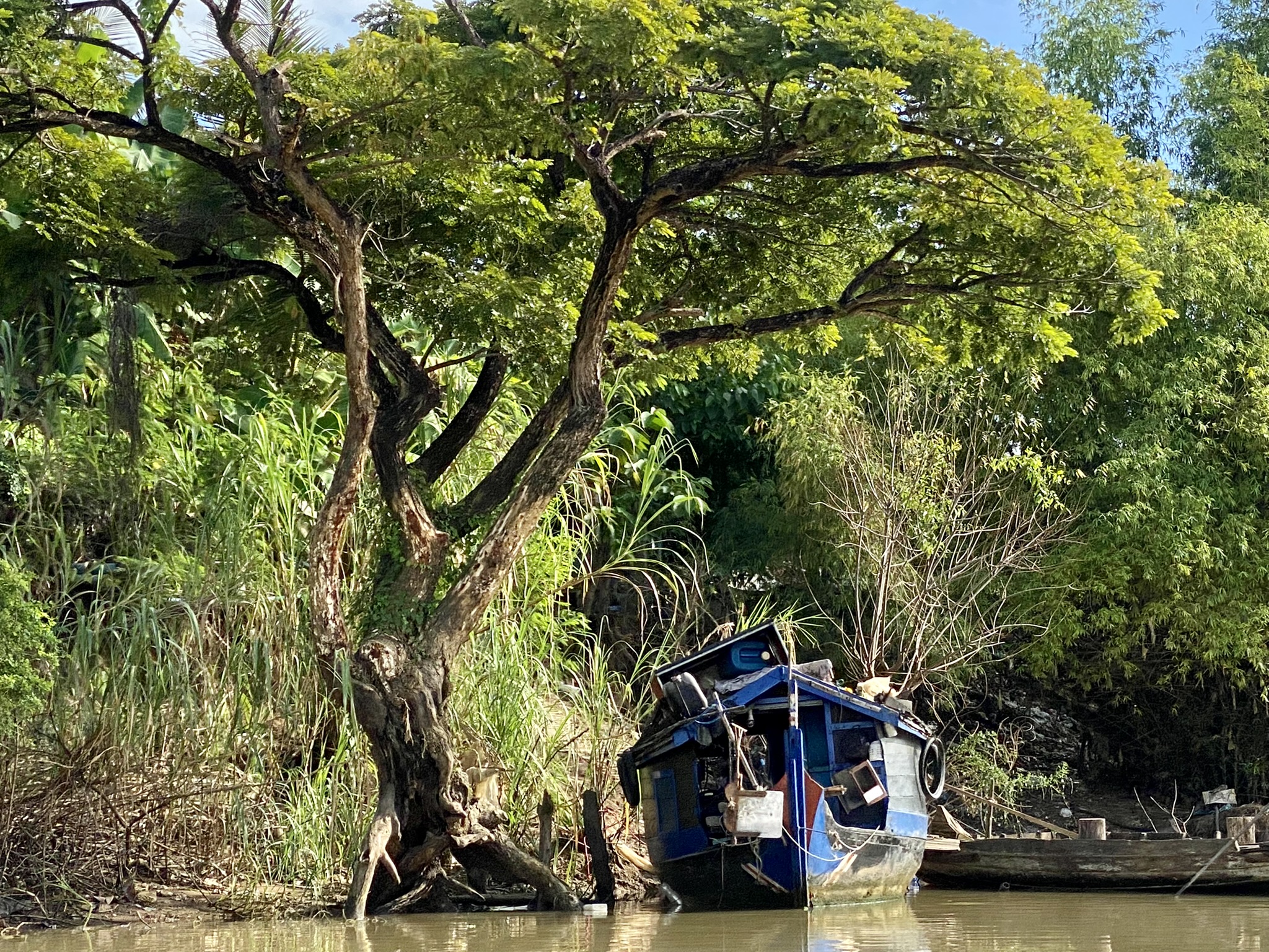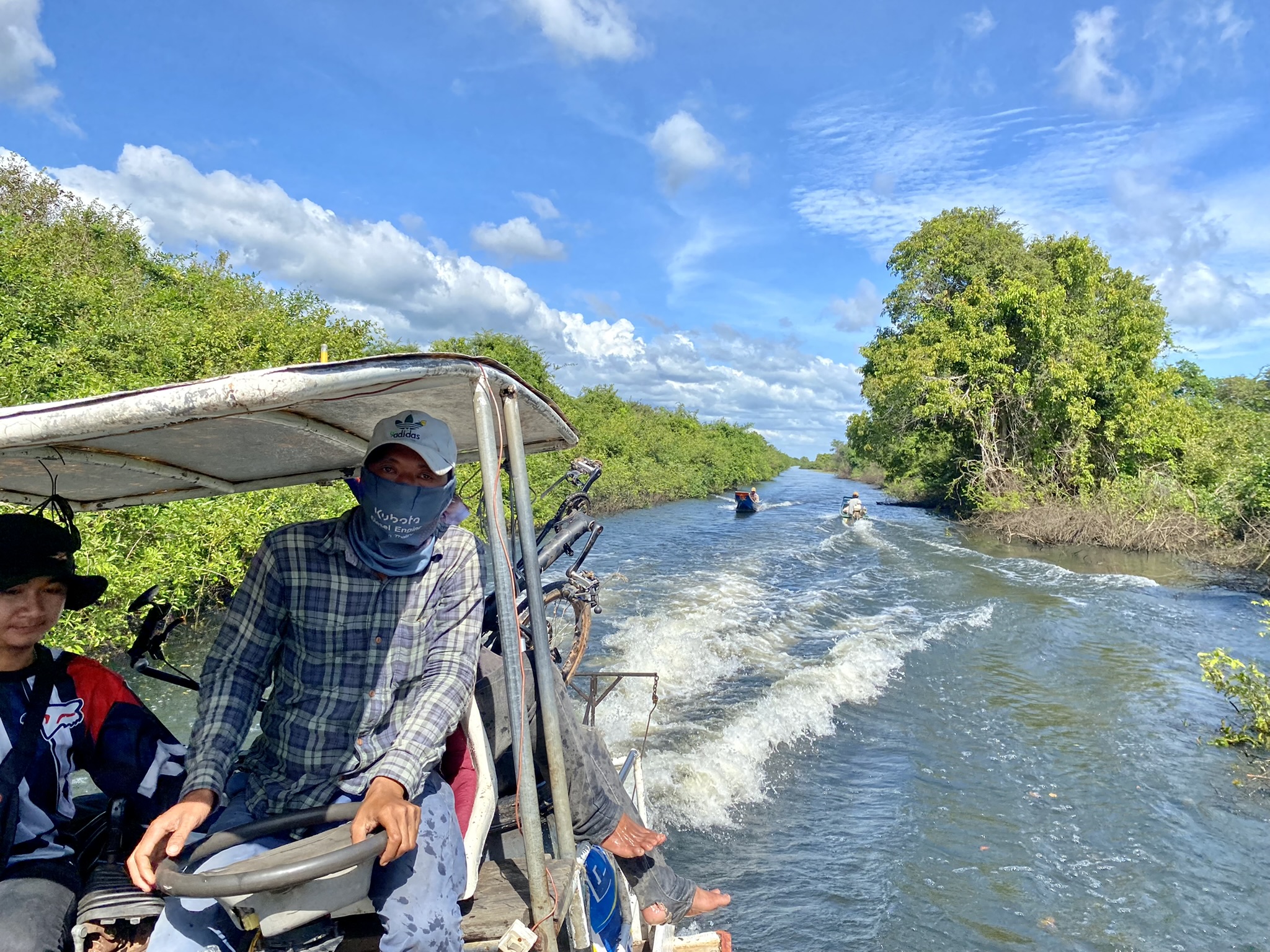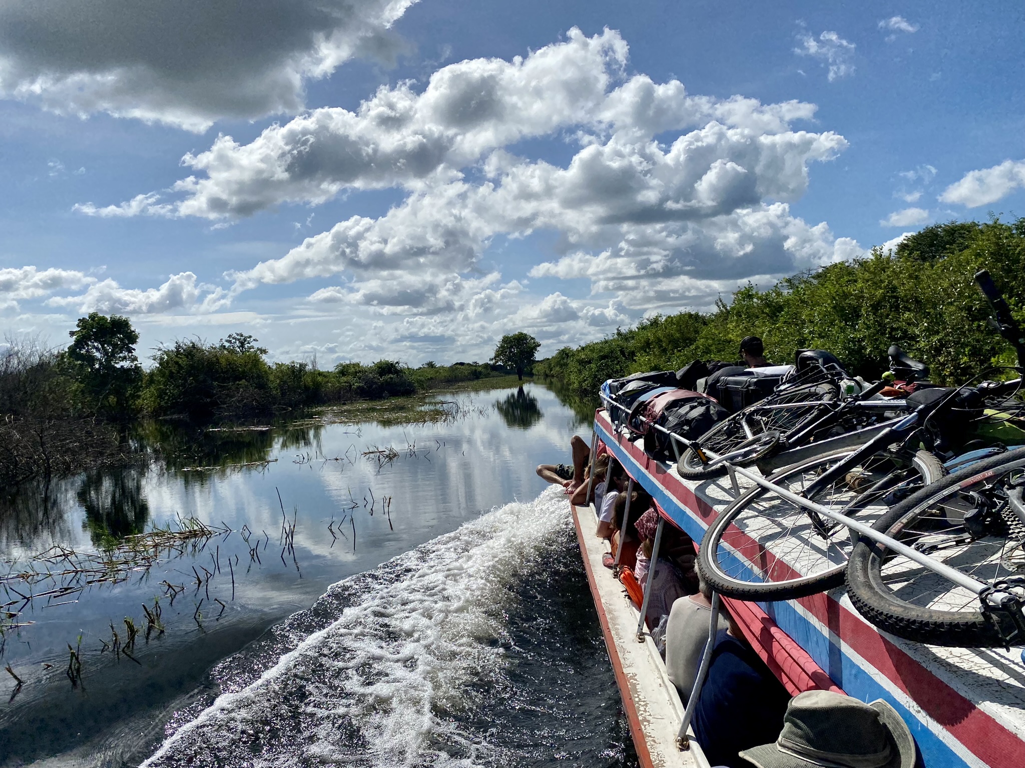 After some time in Siem Reap, I was ready for a mini vacation and decided to take a short trip to visit Battambang. There are three options to get there, minivan, boat, or taxi. The trip by road is about 50 miles/80 km, but with the roads, it takes about 3 hours. The boat is the most expensive option, and also the longest at 4 hours. Of course, I love to be on the water and see all of the little villages, so I chose the boat. Unfortunately, I picked a day where they didn’t run the normal tourist boat with rows of seats, but instead a smaller, not so nice boat with seats around the edges so we could all stare at each other instead of the beautiful scenery. I ended up at the very back of the boat, in front of the toilet (which was awesome if you were less than 3′ tall), engine, and captain. Luckily I had my earplugs handy in my backpack as they gave me some protection from the crazy loud engine. Once we were sufficiently packed in and all the luggage and a few bikes secured on top, we started moving….slowly! And, as it goes, we soon made a couple more stops to pick up some local passengers as well as a live crocodile covered in rice bags (WTF?), that was placed on the floor in front of the toilet and directly behind me. Okay, here we go…hot, sweaty, so much leg room, and sucking in fumes, what a treat!