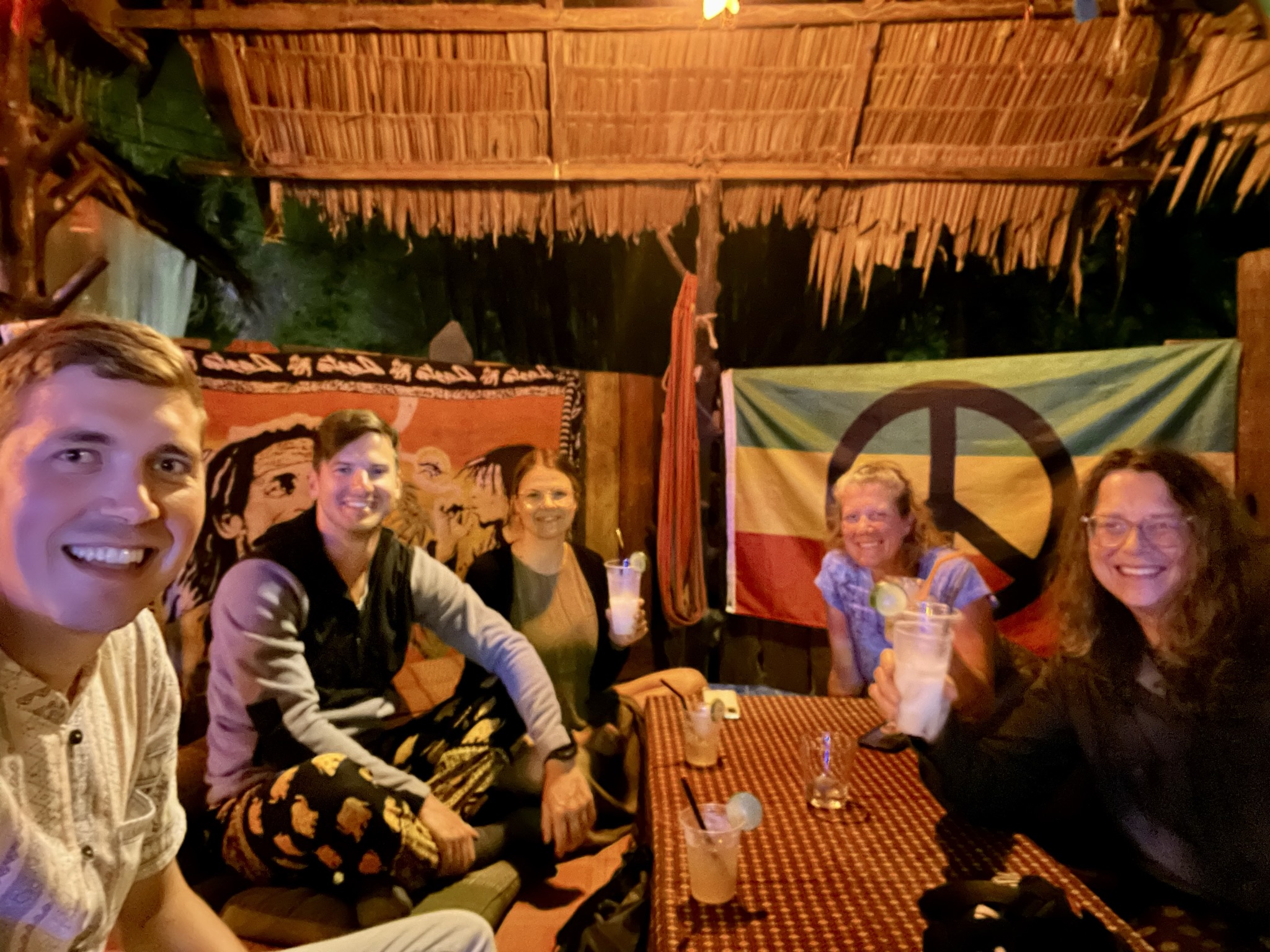 We loaded in the van and drove back to town. When we arrived, the four others from my resort and I went out for New Year’s dinner at a local restaurant and talked about the gorgeous day. Bellies full, we walked around before landing in the Jumanji Reggae Bar/Bamboo Tattoo Studio for drinks and dancing. There were only a few other people, and the bartender turned dance DJ after we were all feeling good. We made our own dance floor in the dirt parking lot and tore it up as we watched the local fireworks show from the road.