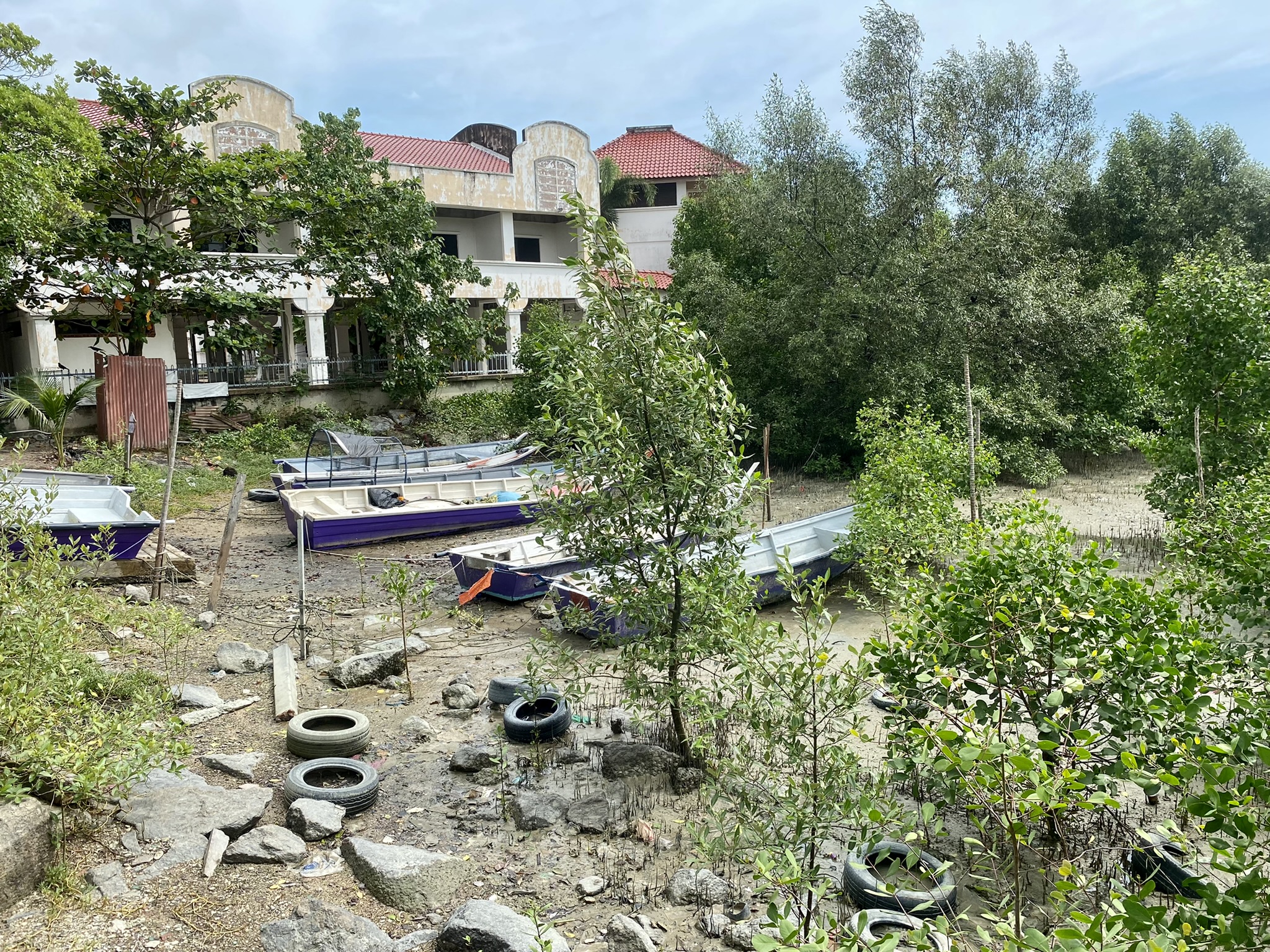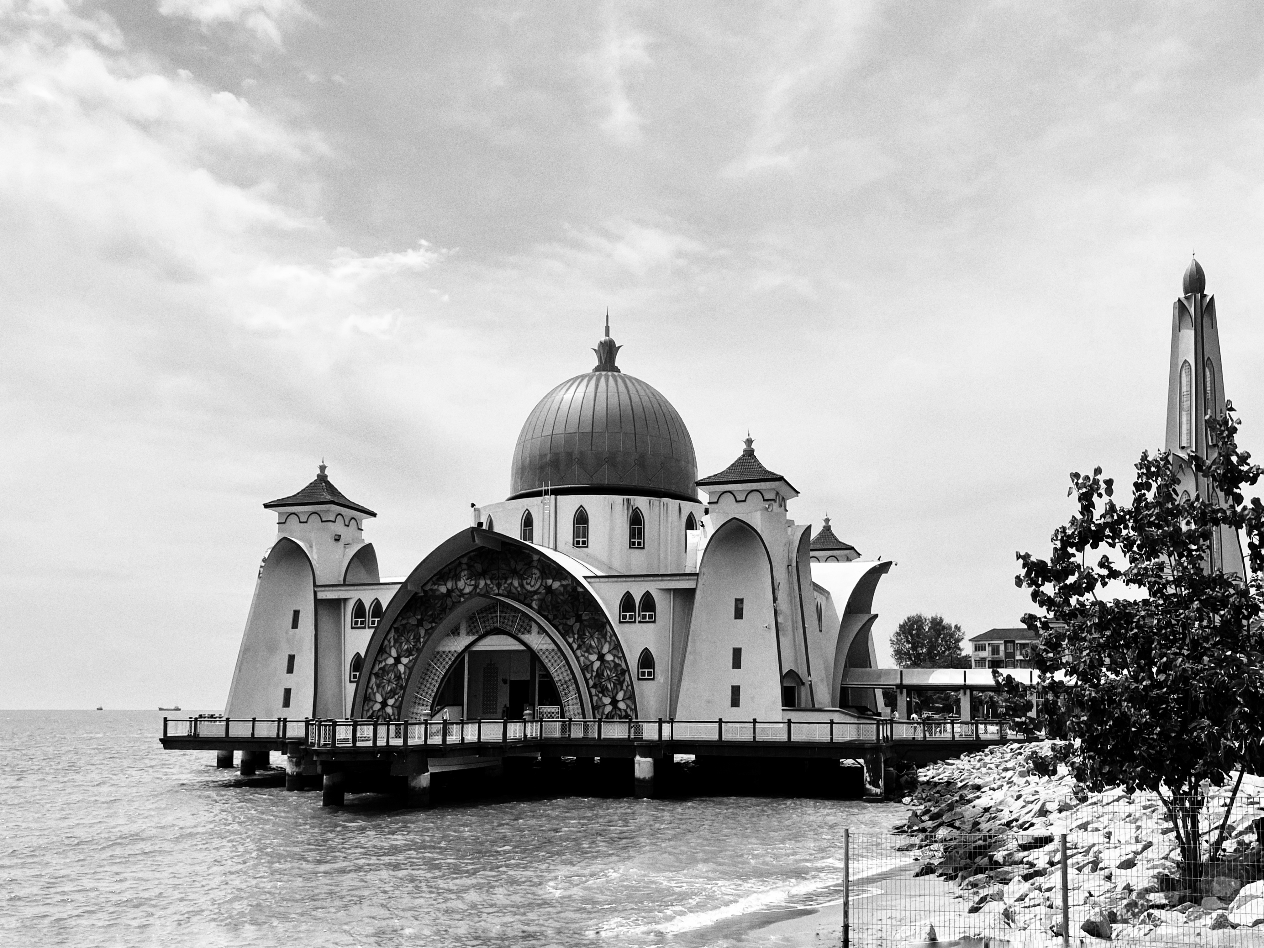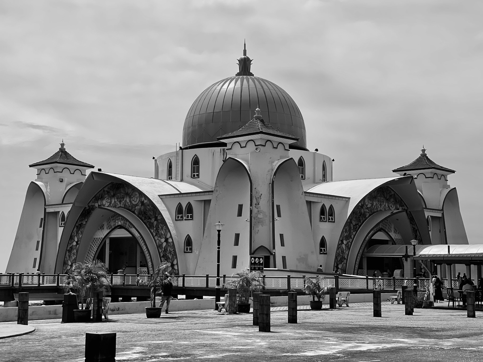 Oh, and I almost forgot, I took a really long walk to Melaka Island one day in the hot sun to see Melaka Straits, the floating mosque. The island was supposed to be a paradise of glitzy shopping malls and a huge Arab resort, but all projects were canceled midway through construction and now there are piles of rusty steel, broken concrete, and unfinished buildings. Apparently, there was a major upheaval in the government, and China, the main investor, was expelled by Malaysia? Anyway, the mosque is there, but I decided to present the pictures in black and white, because the bright pink paint is all faded and crumbling, so it looked much nicer this way!