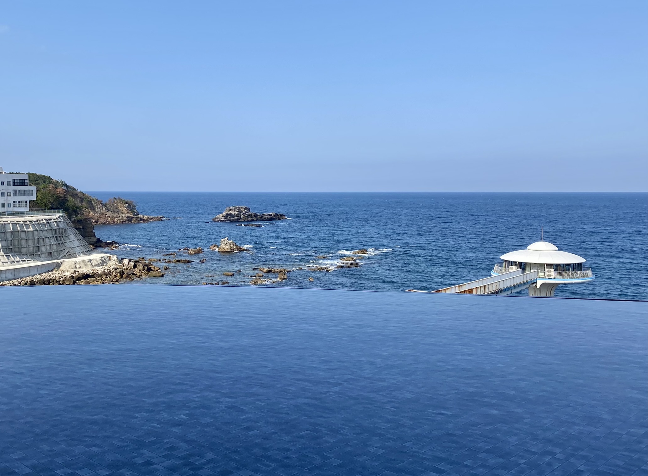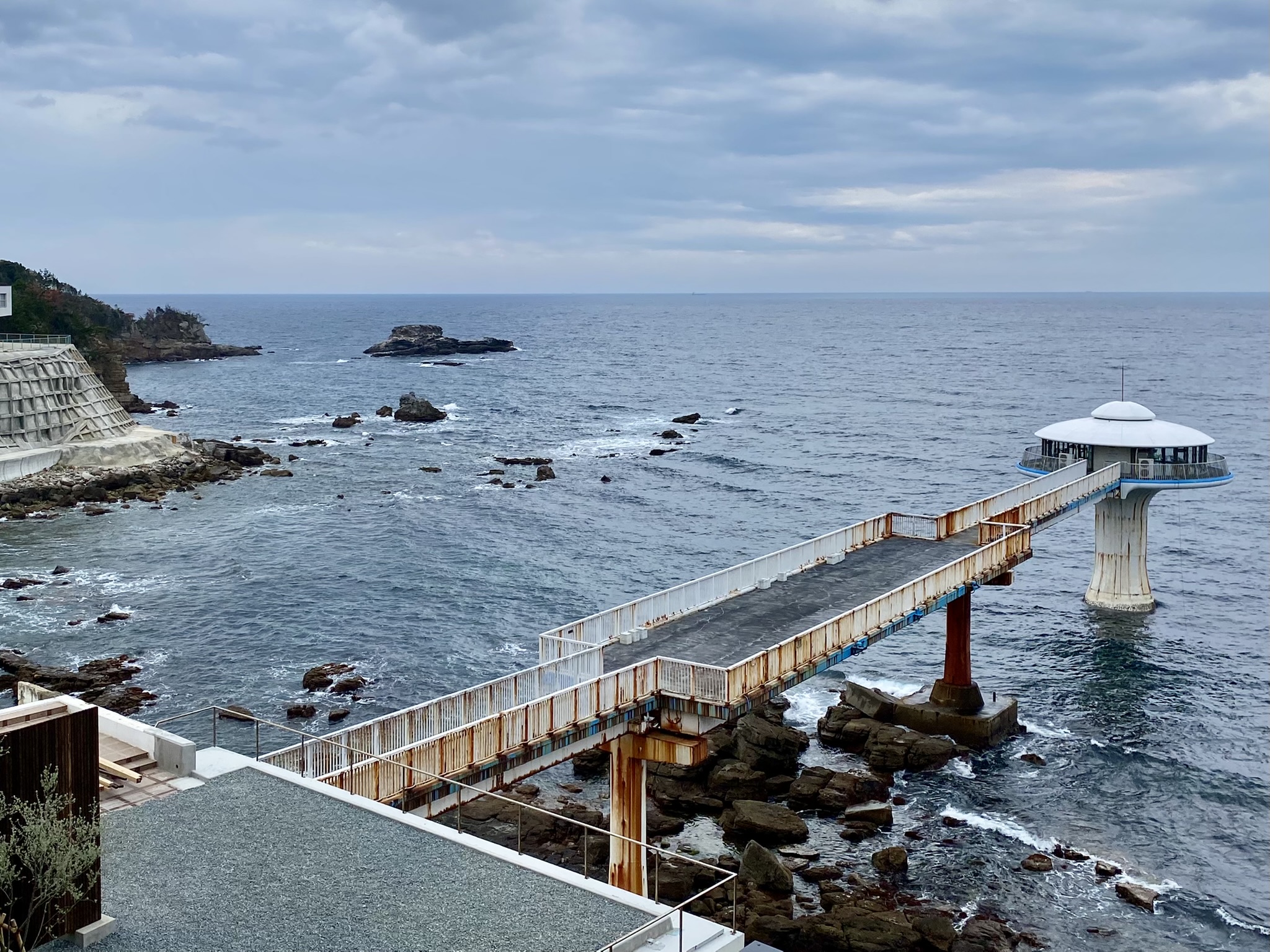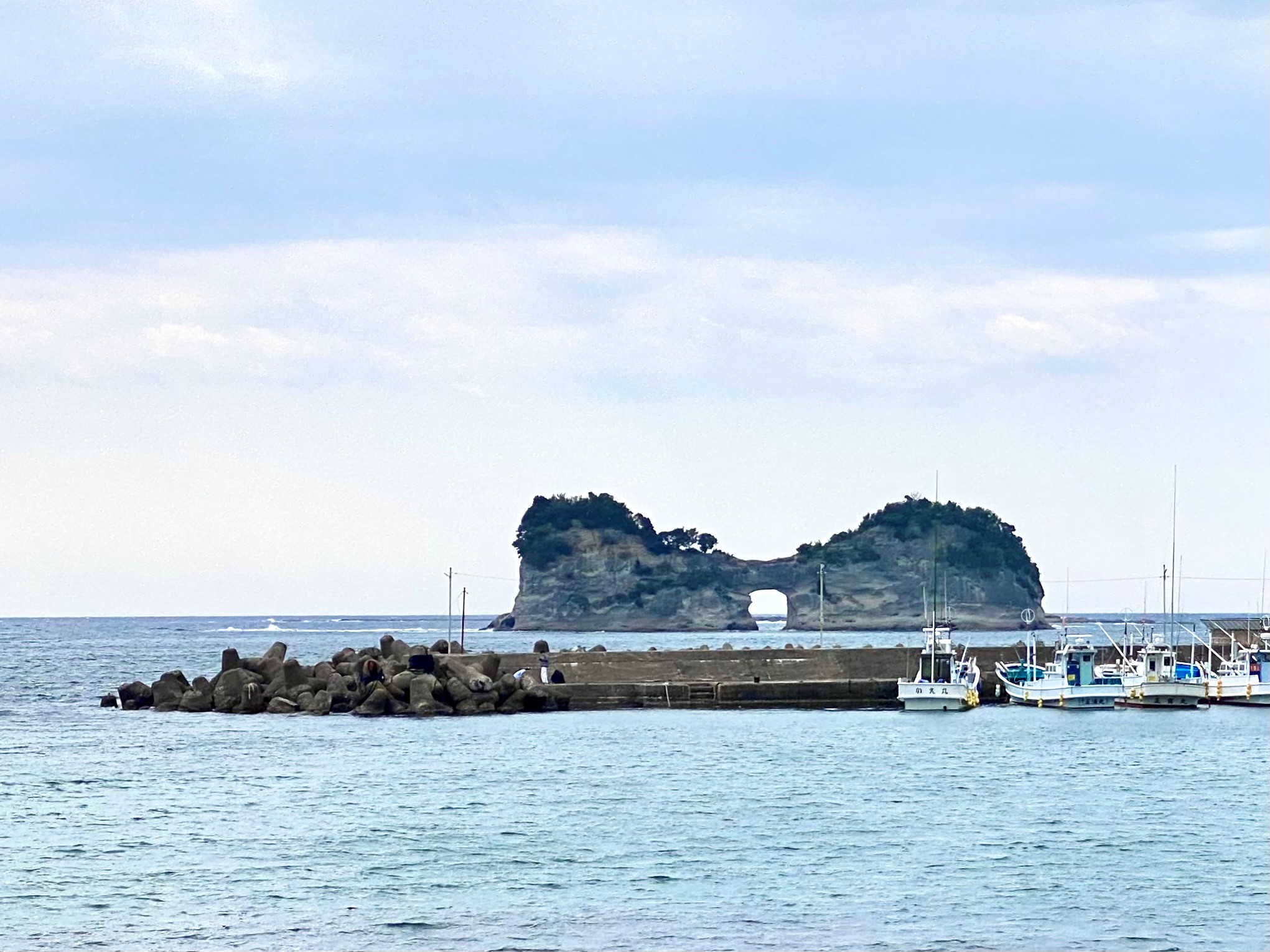 Past the beach, I came upon a torii gate that led me into the peaceful Kumano Sansho Shrine. I passed through and continued until I found a long concrete jetty that took me out over the water to get my first glimpse of Engetsu Island. At certain times of the year the setting sun can be seen through the hole in the middle of the rock. I didn’t catch this, but the island is still pretty!