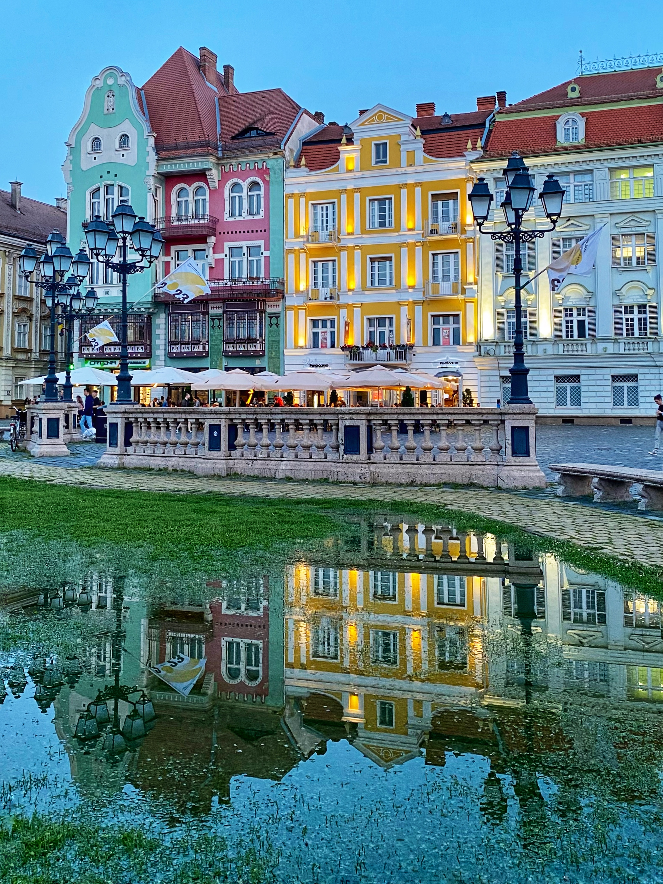 Before I flew to Vienna, I made a rough plan of where I wanted to go with my Eurail pass. Well, plans change quickly! I made it to my first stop, Budapest. Next, I was planning on Lesce Bled, Slovenia, but it was a long train ride, the weather looked bad, and I couldn’t find a place to stay that felt right. Searching around on the Eurail site, I looked at the destinations in Romania and found Timișoara. It had a fun name, so I googled it for a few pics, found an Airbnb that looked good, and made a quick decision to re-route. Timișoara is the third largest city in Romania and often called “Little Vienna” for it’s colorful architecture resembling that of Vienna.