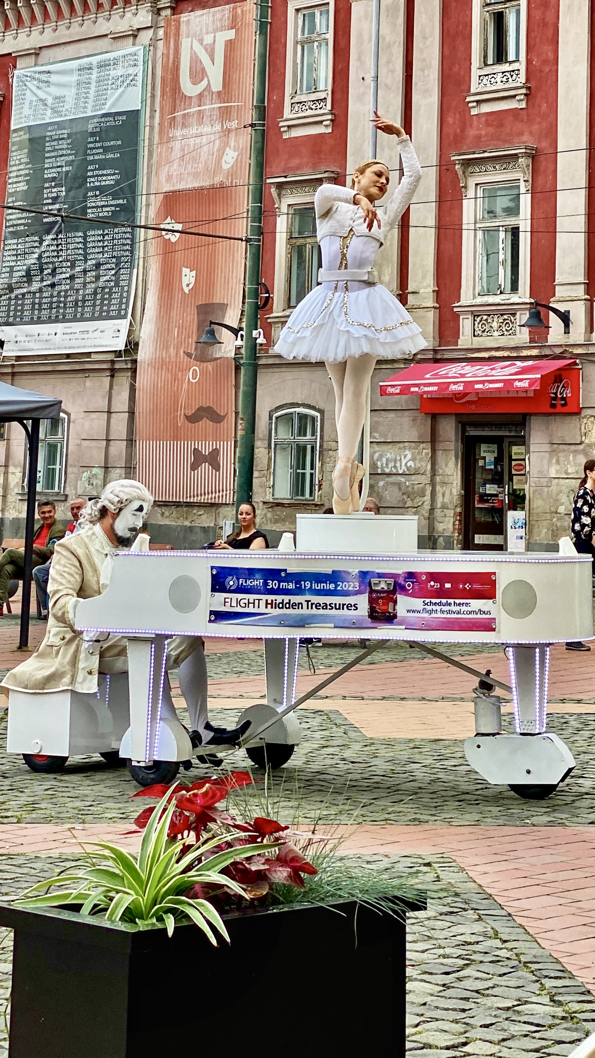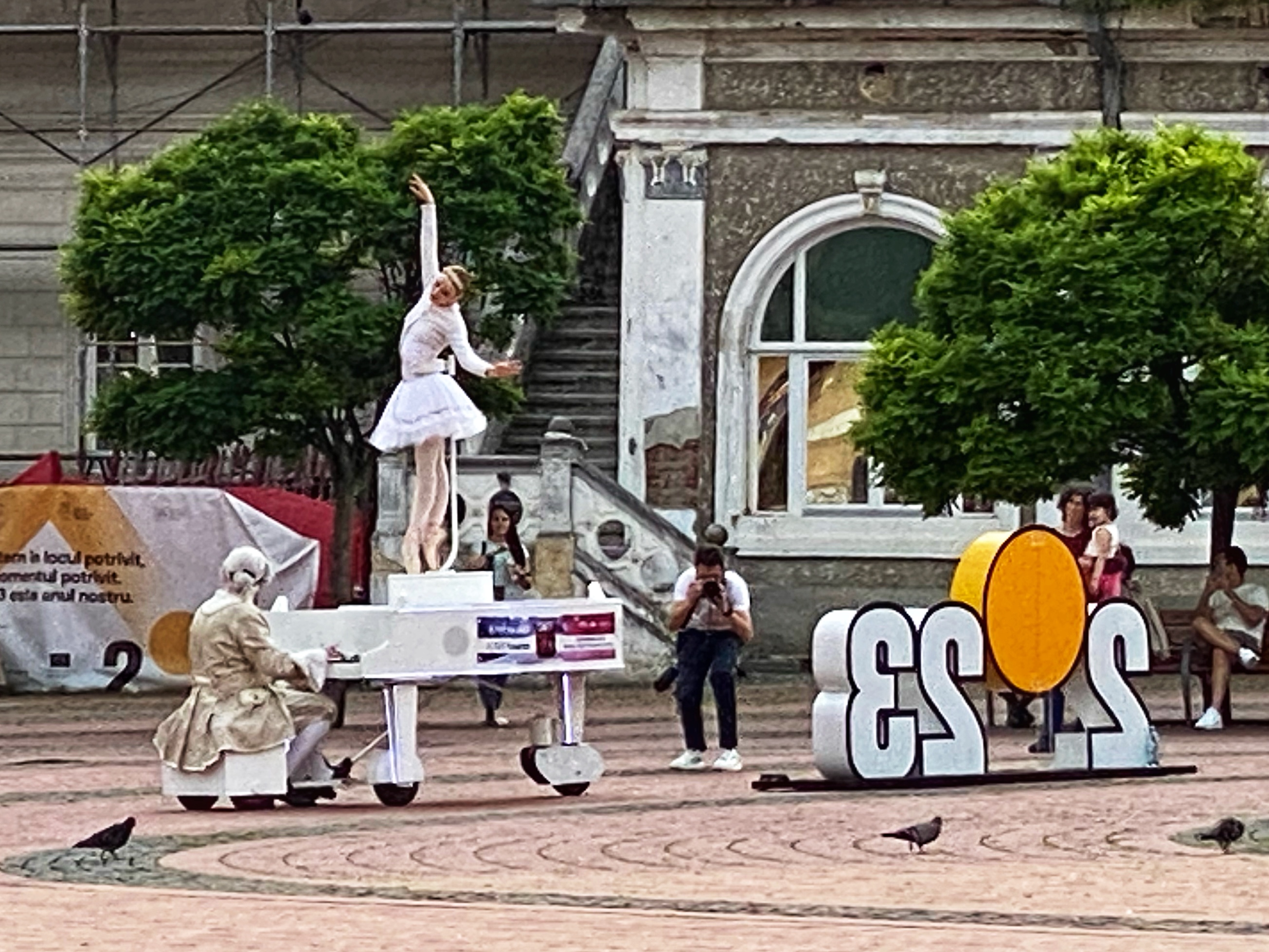 After getting settled, I went out to explore the square and the surrounding area. As it turns out, Timișoara is one of the three cities that was elected Cultural Capital of Europe for 2023. Pretty cool! They had a little trailer setup on the square with a schedule of several music events and happenings around town as well as several easels with photos of the town over the years.