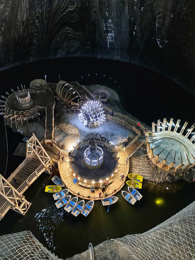 Salina Turda isย one of the oldest salt mines in Europe. It began in the pre-Roman era, around 1075, and was active until 1932. One area, the Terezia conical (bell) mine was so impressive! It is 112 meters (367 ft) deep from the mouth of the shafts to the base of the mine. At the bottom of the mine, there is an underground lake, a “cascade” of salt, and stalactites. Since becoming a halotherapy center and tourist attraction in 1992 (renovated in 2008), you are able to boat around the lake.