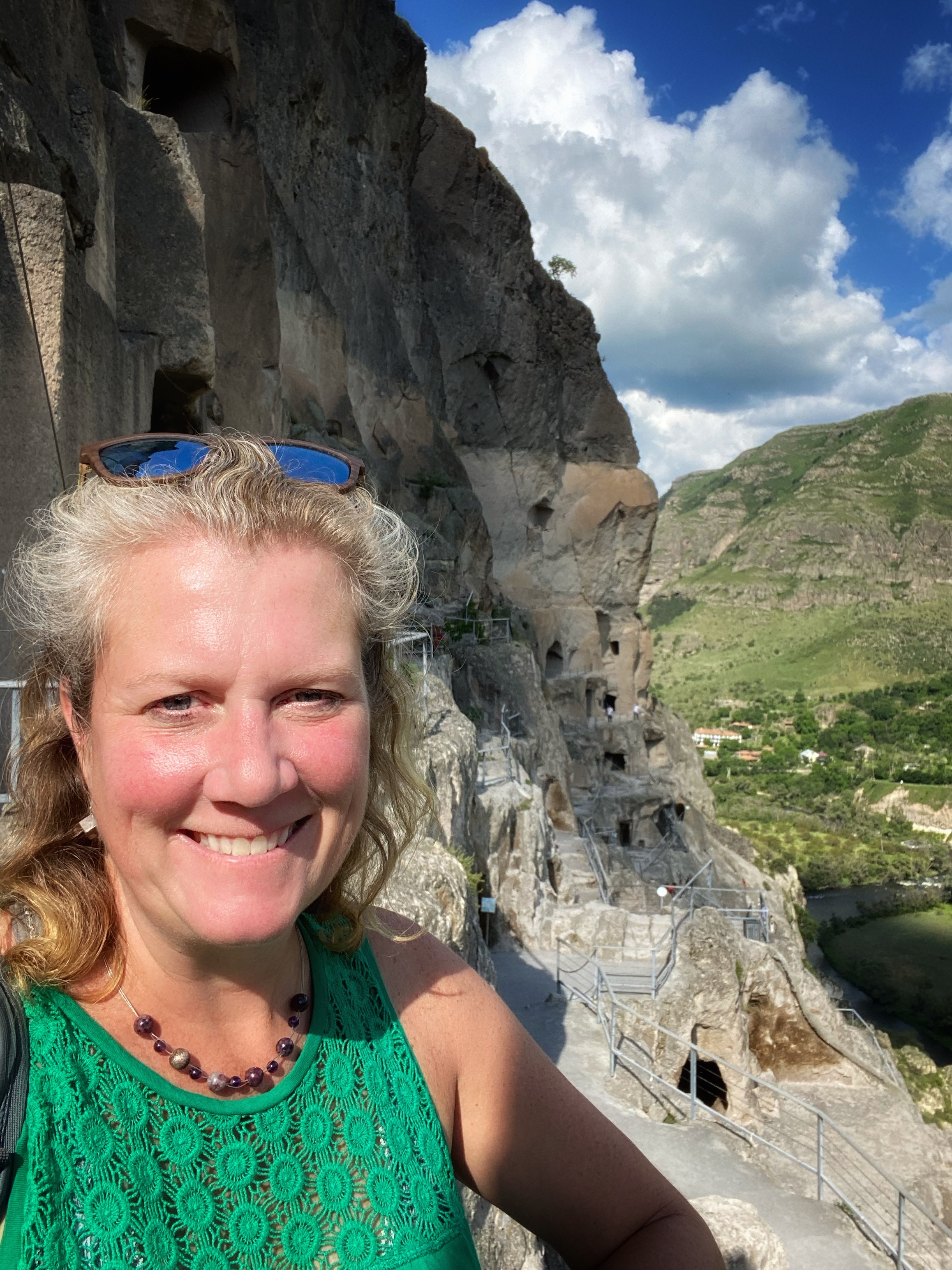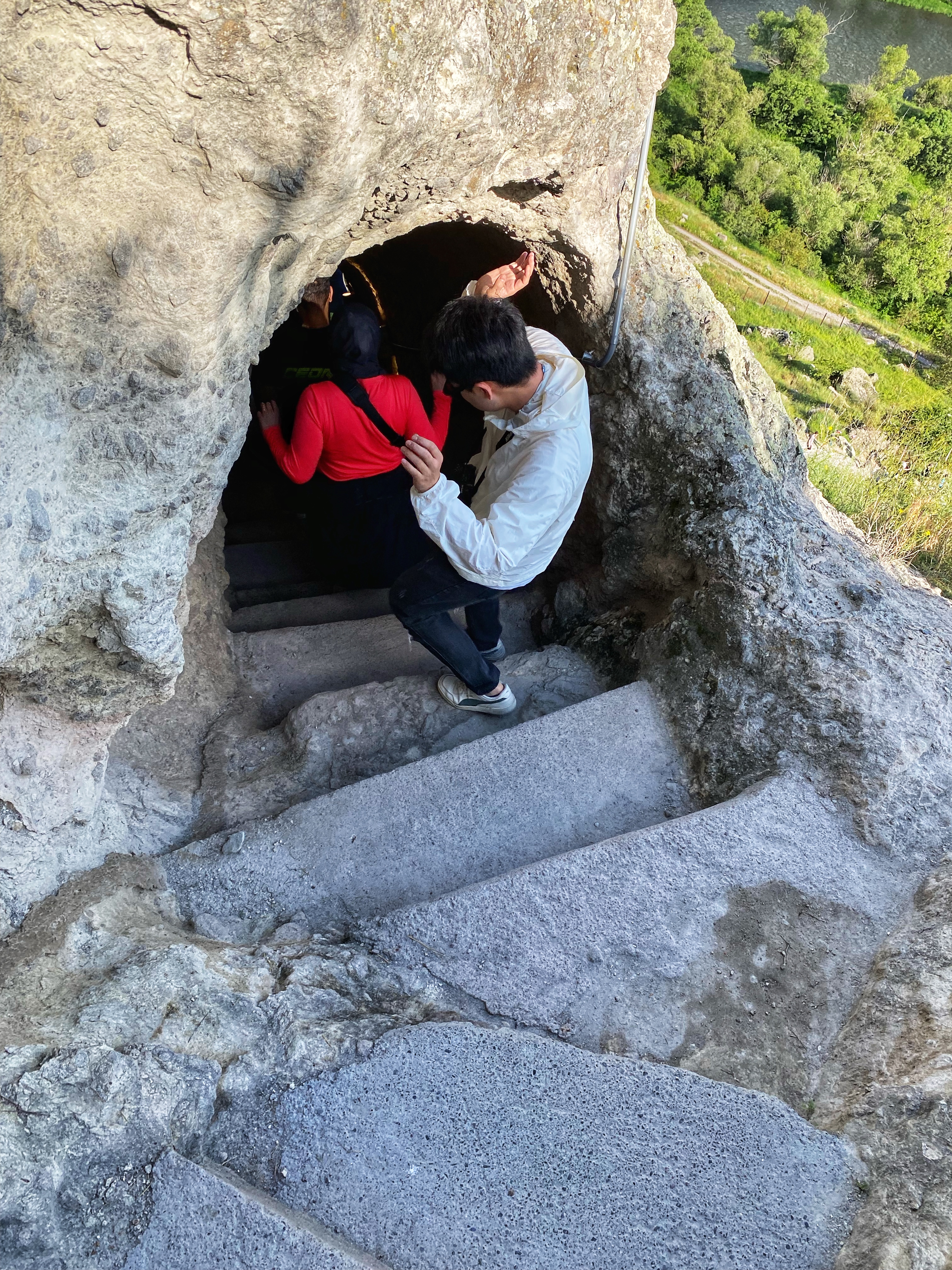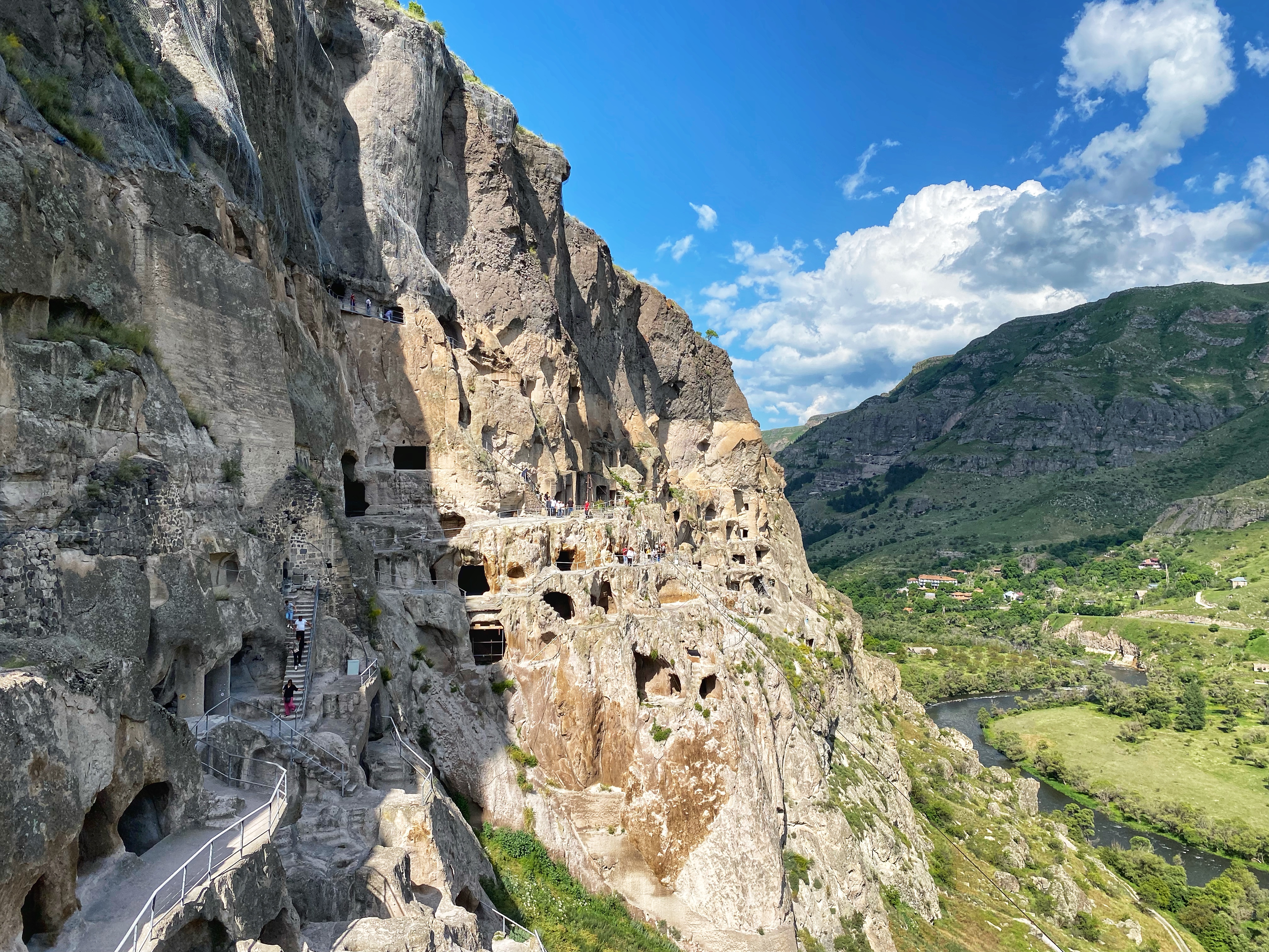 After lunch, we continued south until we finally reached the Vardzia cave monastery built in the side of the Erusheti mountain. The monastery came to be during desperate times in the late 1100’s when the medieval kingdom of Georgia was trying to fight off the Mongol hoards. Queen Tamar ordered the construction of this underground sanctuary in 1185, and when completed, it was 13 levels with 6000 apartments, a throne room, and a large church with an external bell tower. Unfortunately, the amazing feat of construction didn’t last long, as more than 2/3 of it was destroyed by an earthquake in 1283, exposing the hidden innards of the remaining section. Despite the drama, the community carried on until 1551 when it was raided by the Persian Sash Tahmasp.