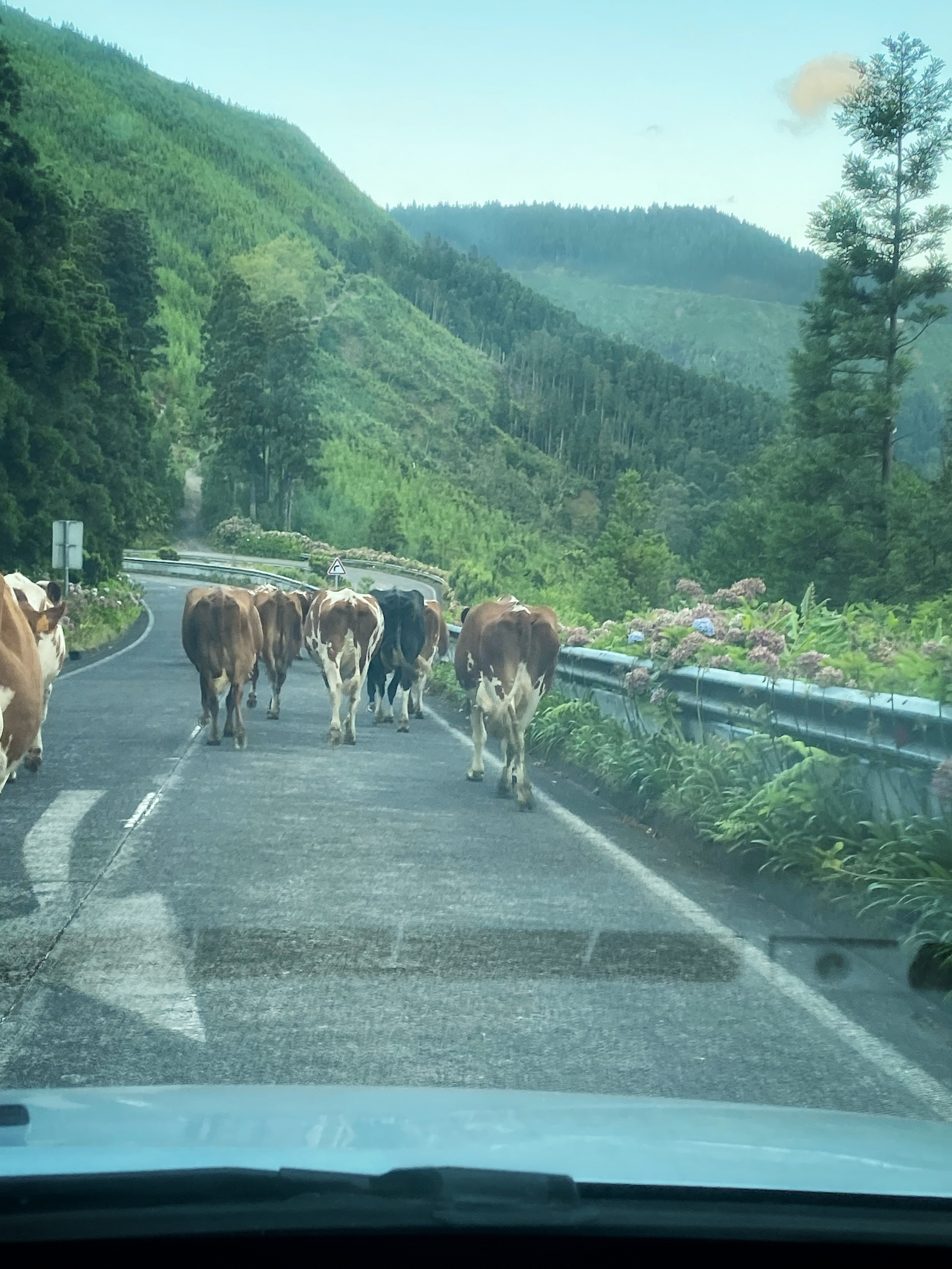 The next day, I headed out early in the morning to Sete Cidades, an area literally located in a massive volcanic crater, 3 miles across. During the drive, I got wedged in the middle of a herd of cattle out for their morning walk. Finally, I made it around all of them after some honking, being careful not to make hamburger. They were much bigger than the little Citroën we rented, so I wouldn’t have won that fight!