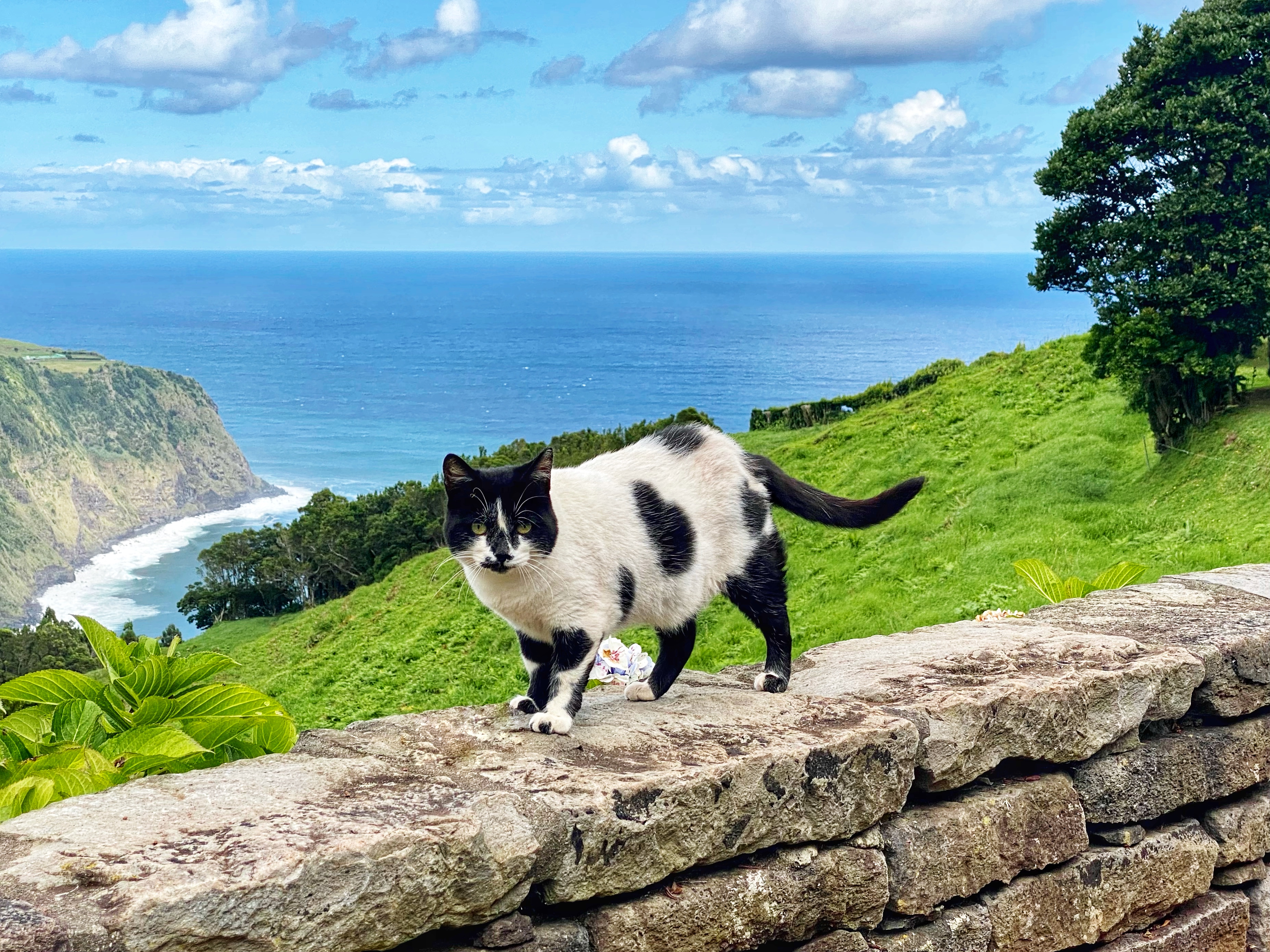 My final solo day, I explored the northeast side of the island where the hydrangeas still had more healthy blooms and it was even more quiet. I was the first person on the trail which led me to some beautiful pools and waterfalls. Unfortunately, I got caught in a heavy downpour for a bit and the waterfalls weren’t at their fullest, but it was still awesome! I also stopped at a couple of amazing viewpoints on the way back which had tons of sweet cats hanging out begging for love. I will never turn down kitty snuggles!!
