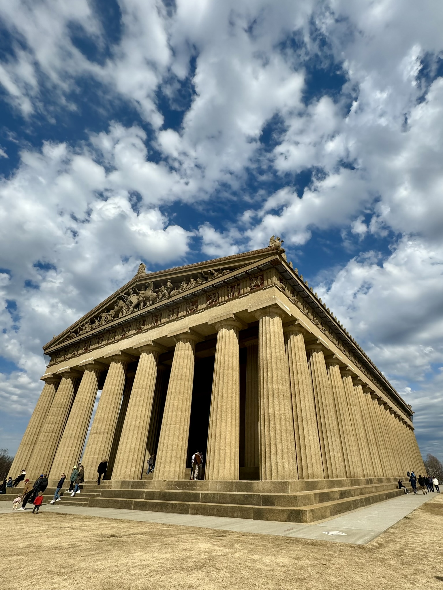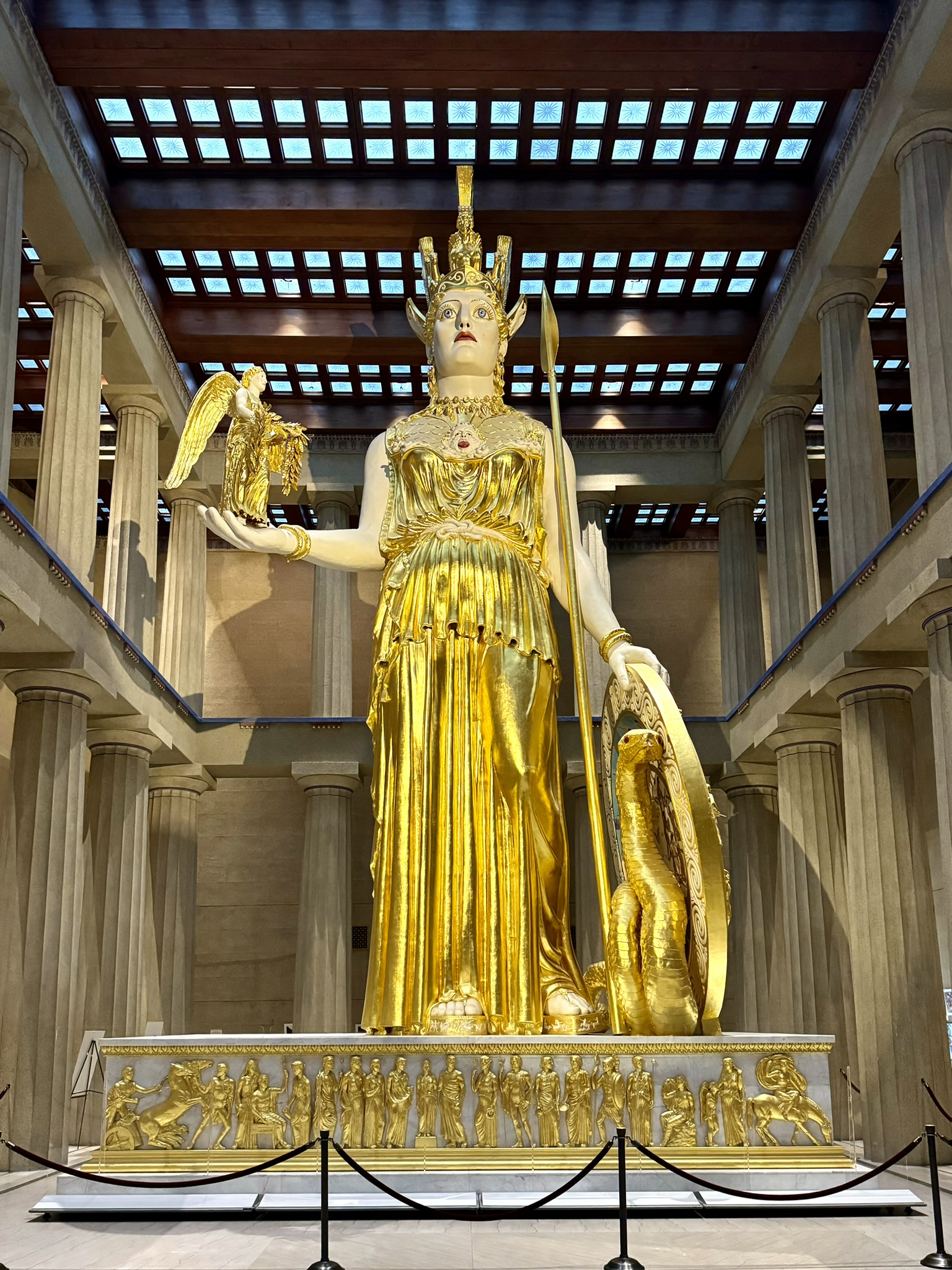 Susan, my mother-in-law, had told me there was a full-size Parthenon replica in Nashville, complete with a 42-foot statue of the beautiful Athena in her shrine, just as she stands in Athens. Athena is the goddess of wisdom, craft, courage, and warfare. I had to stop and meet her and stand in her power! It was meant to be. While waiting in line for it to open, chatting with a couple from California, a man came up to us and offered us three tickets he had decided not to use….I was then the first one in to meet Athena and got to spend a few quiet minutes with her!!